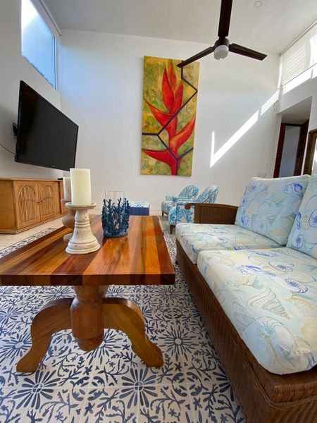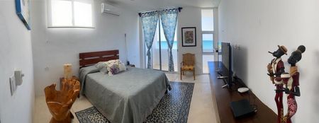 • Principal en planta baja, cama Queen con baño walk in closet con salida a la terraza con jardín y preciosa vista al mar, aire acondicionado, terraza y sala.